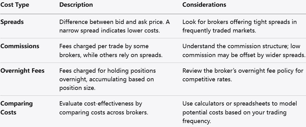 يمكن أن تؤثر تكاليف التداول بشكل كبير على ربحيتك في تداول العقود مقابل الفروقات (CFD). من الضروري فهم التكاليف المختلفة المرتبطة بالتداول، والتي عادةً ما تشمل الفروق السعرية، والعمولات، ورسوم التمويل الليلي.
