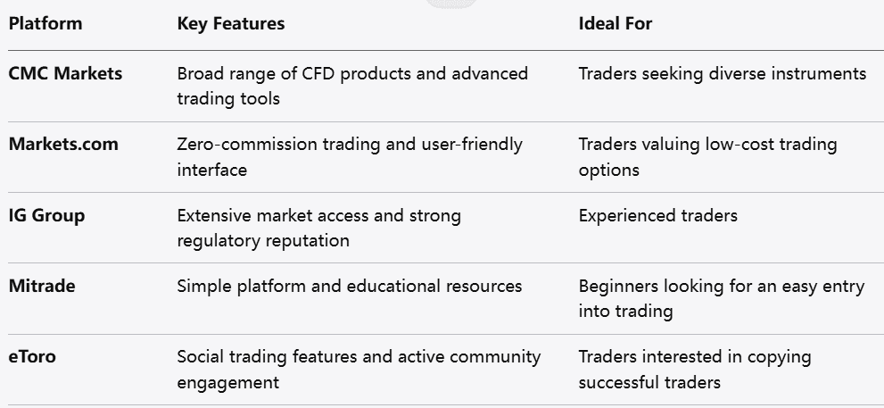 مع تطور مشهد تداول العقود مقابل الفروقات، يبحث المتداولون بشكل متزايد عن منصات توفر ميزات قوية، موثوقية، ووصولًا متنوعًا للأسواق. يعد اختيار الوسيط المناسب أمرًا أساسيًا للنجاح في هذا البيئة الديناميكية. فيما يلي نظرة على خمس من أفضل منصات تداول CFD لعام 2026: CMC Markets، Markets.com، IG Group، Mitrade، وeToro. لكل منصة نقاط قوة وعروض فريدة، مما يجعلها مناسبة لأنماط تداول وتفضيلات مختلفة.