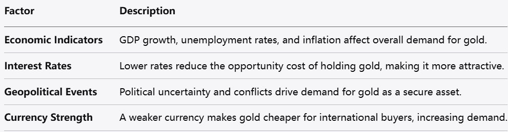 المؤشرات الاقتصادية: تؤثر معدلات نمو الناتج المحلي الإجمالي، ومعدلات البطالة، والتضخم على الطلب على الذهب.