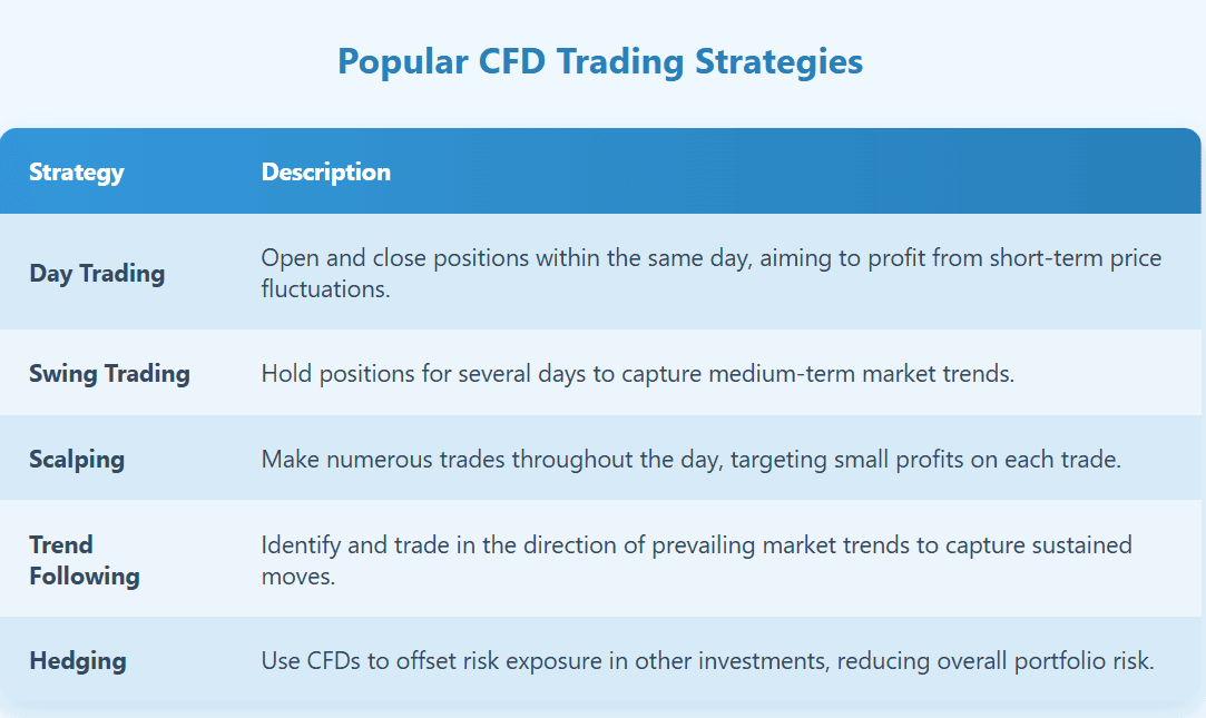 يمكن تطبيق عدة استراتيجيات في تداول عقود الفروقات حسب أسلوب المتداول وأهدافه.