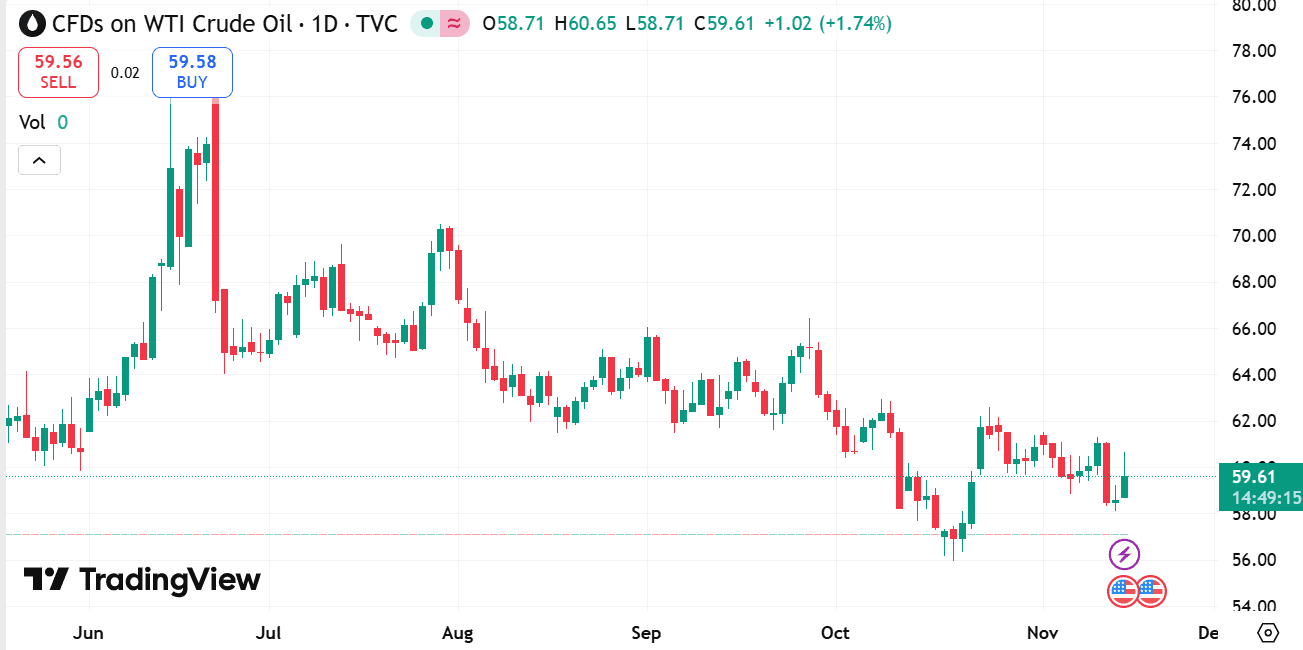 بينما لا يعتمد المتداولون على نقاط سعر محددة، فإنهم يراقبون أنماطًا مثل مستويات المقاومة، والمتوسطات المتحركة، وتحولات الزخم التي قد تشير إلى ضعف الاتجاهات في WTI.