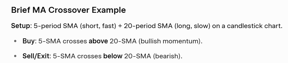 المتوسطات المتحركة تعمل على تنعيم بيانات الأسعار لمساعدة المتداول على التعرف على الاتجاهات. أكثر الأنواع شيوعًا هي المتوسط المتحرك البسيط (SMA) والمتوسط المتحرك الأسي (EMA). نهج شائع هو مراقبة العلاقة بين متوسط متحرك قصير المدى وأخر طويل المدى. على سبيل المثال، عندما يتقاطع المتوسط قصير المدى فوق المتوسط طويل المدى، قد يشير ذلك إلى بداية اتجاه صعودي.
