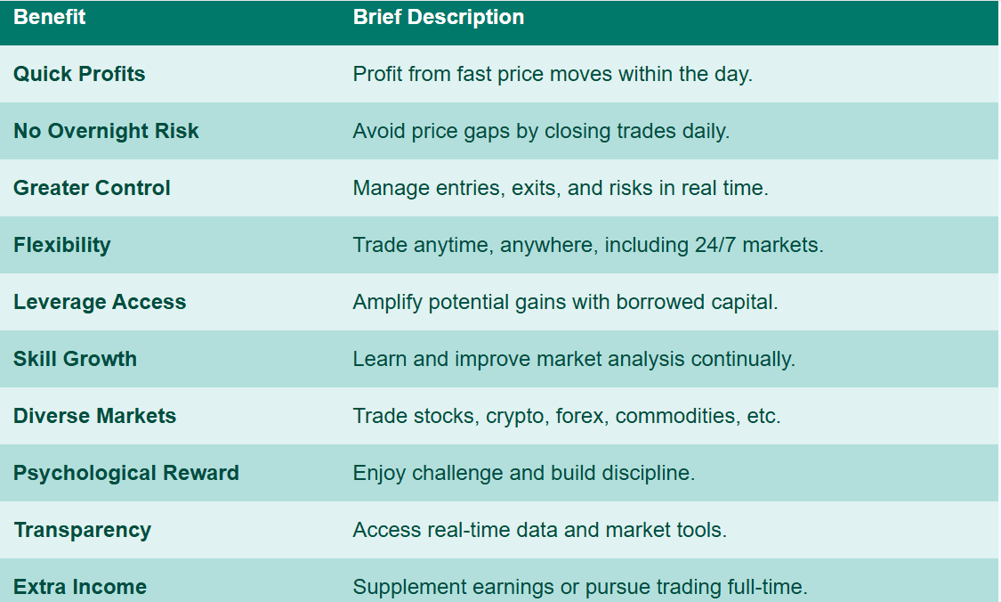 ورغم أن التداول اليومي لا يضمن الربحية، فإن المتداولين المنضبطين الذين يطورون استراتيجيات قوية قد يحققون أرباحًا مستقرة. بالنسبة للبعض، يوفر حرية الاستغناء عن الوظائف التقليدية والسعي نحو الاستقلال المالي.