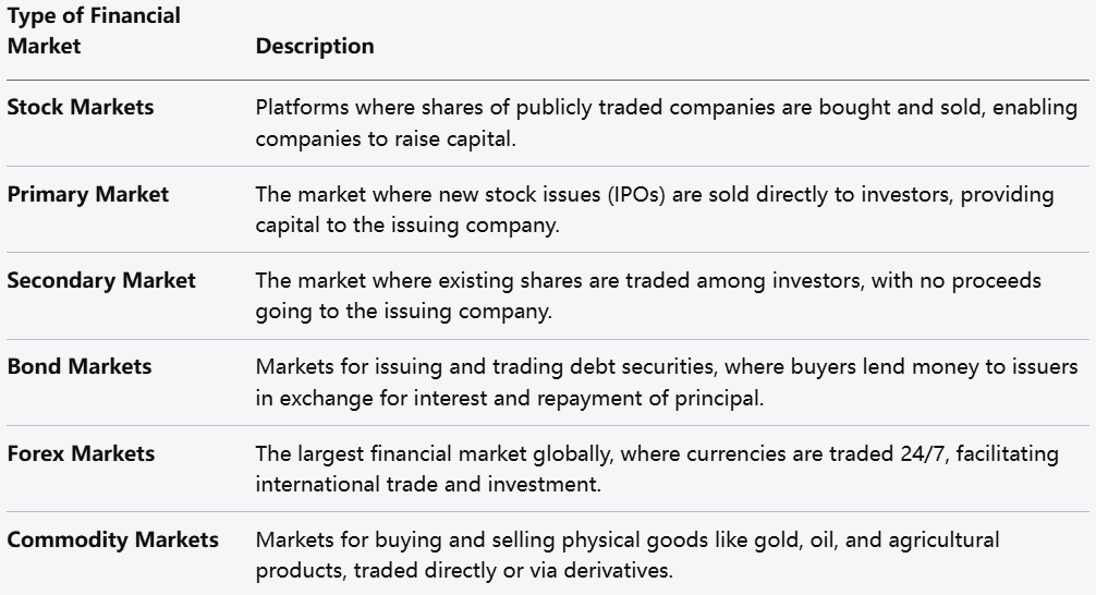 الأسواق المالية هي منصات يلتقي فيها البائعون والمشترون لتداول الأصول مثل الأسهم، والسندات، والعملات، والسلع. تسهّل هذه الأسواق تبادل رأس المال وتوفر آليات لاكتشاف الأسعار، وتوفير السيولة، وإدارة المخاطر.