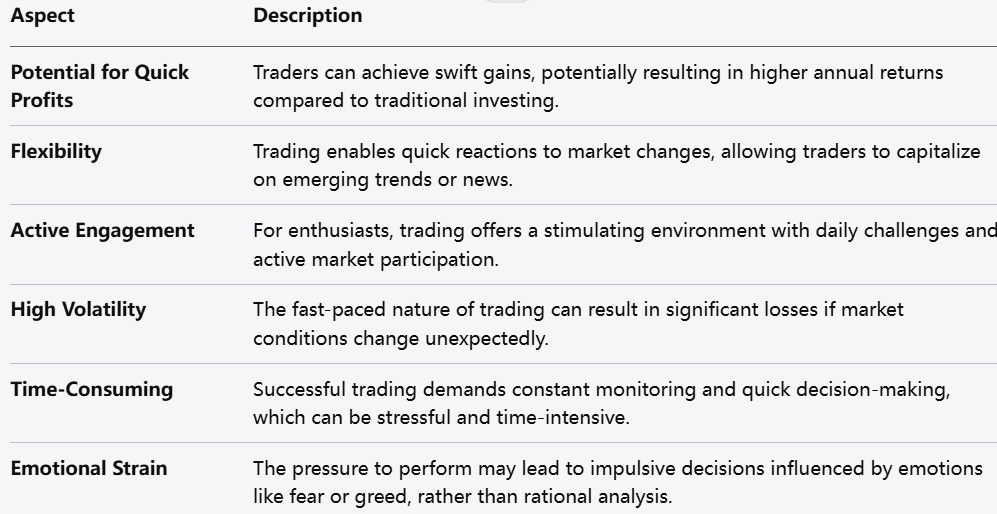 يعتمد الاختيار بين التداول والاستثمار غالبًا على الأهداف والتفضيلات الشخصية. إذا كان لديك قدرة عالية على تحمل المخاطر، وتستمتع بتحليل الاتجاهات، ولديك الوقت المخصص للأسواق المالية، فقد يكون التداول مناسبًا لك. ومع ذلك، إذا كنت تفضل نهجًا أكثر استقرارًا وطويل الأجل يركز أساسًا على تحقيق الأهداف المالية من خلال النمو التدريجي، فإن الاستثمار من المرجح أن يكون الخيار الأفضل.