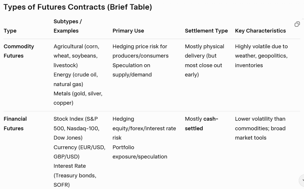عقود المؤشرات الآجلة: وهي عقود تستند إلى مؤشرات أسواق الأسهم، مثل مؤشر S&P 500 أو داو جونز، وتتيح للمتداولين المضاربة على الحركة العامة لسوق الأسهم.