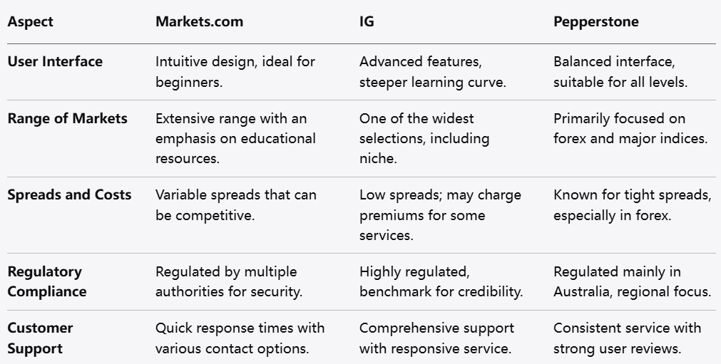 يعتمد اختيار أفضل منصة لتداول عقود الفروقات في النهاية على أسلوبك في التداول، تفضيلاتك، ومستوى خبرتك. تبرز Markets.com بفضل مواردها التعليمية ونهجها سهل الاستخدام. تتفوق IG في تقديم مجموعة واسعة من الأسواق وأدوات التداول المتقدمة، مما يجعلها مناسبة للمتداولين ذوي الخبرة. أما Pepperstone فتستقطب متداولي الفوركس الحريصين على التكلفة والمهتمين بسرعة التنفيذ.