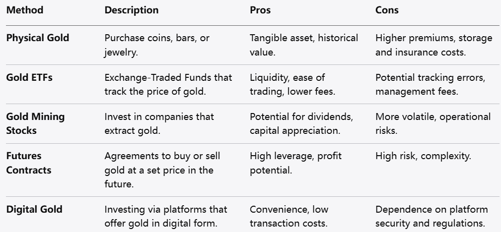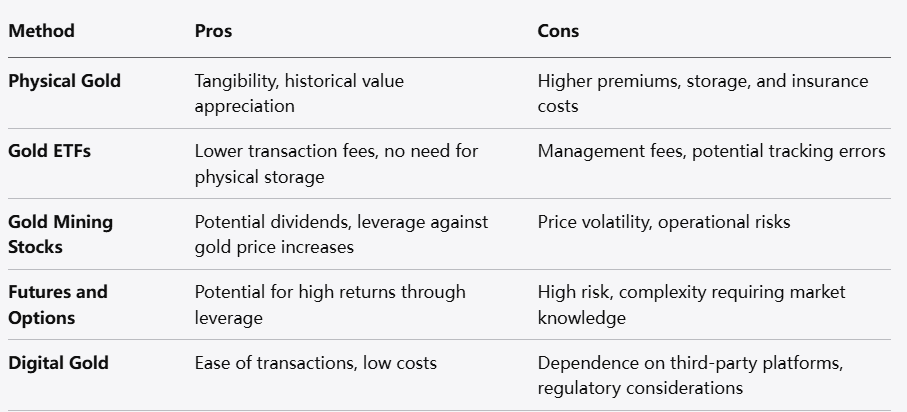 يتطلب الدخول إلى مجال استثمار الذهب النظر بعناية في الأساليب المختلفة. كل طريقة تأتي مع مجموعة من المزايا والعيوب الخاصة بها.