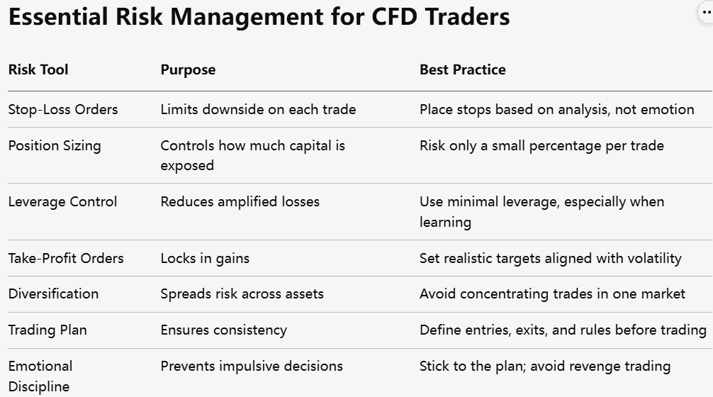 بالنسبة للمبتدئين، قد تكون عقود الفروقات مناسبة فقط إذا كانوا يفهمون تمامًا كيفية عملها ومستعدين لتحمّل مستوى المخاطر المرتفع. فهي أدوات معقّدة، وغالبًا ما تحذّر الجهات الرقابية من أن نسبة كبيرة من حسابات المتداولين الأفراد تخسر أموالها عند تداول عقود الفروقات. إذا قررت استخدامها، فابدأ بمبالغ صغيرة، واستخدم أوامر وقف خسارة صارمة، وتجنّب التداول خلال الأحداث شديدة التقلب حتى تكتسب خبرة أكبر. كما يجب التأكد من أن وسيطك منظَّم بشكل جيد، وشفاف في التسعير، ويقدّم أدوات قوية لإدارة المخاطر.