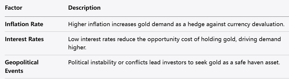 يُنظر إلى الذهب على أنه أصل ملاذ آمن. في أوقات الاضطرابات الاقتصادية، مثل الركود أو انهيار الأسواق، يلجأ المستثمرون عادةً إلى الذهب لحماية رؤوس أموالهم، ما يؤدي غالبًا إلى ارتفاع الأسعار.