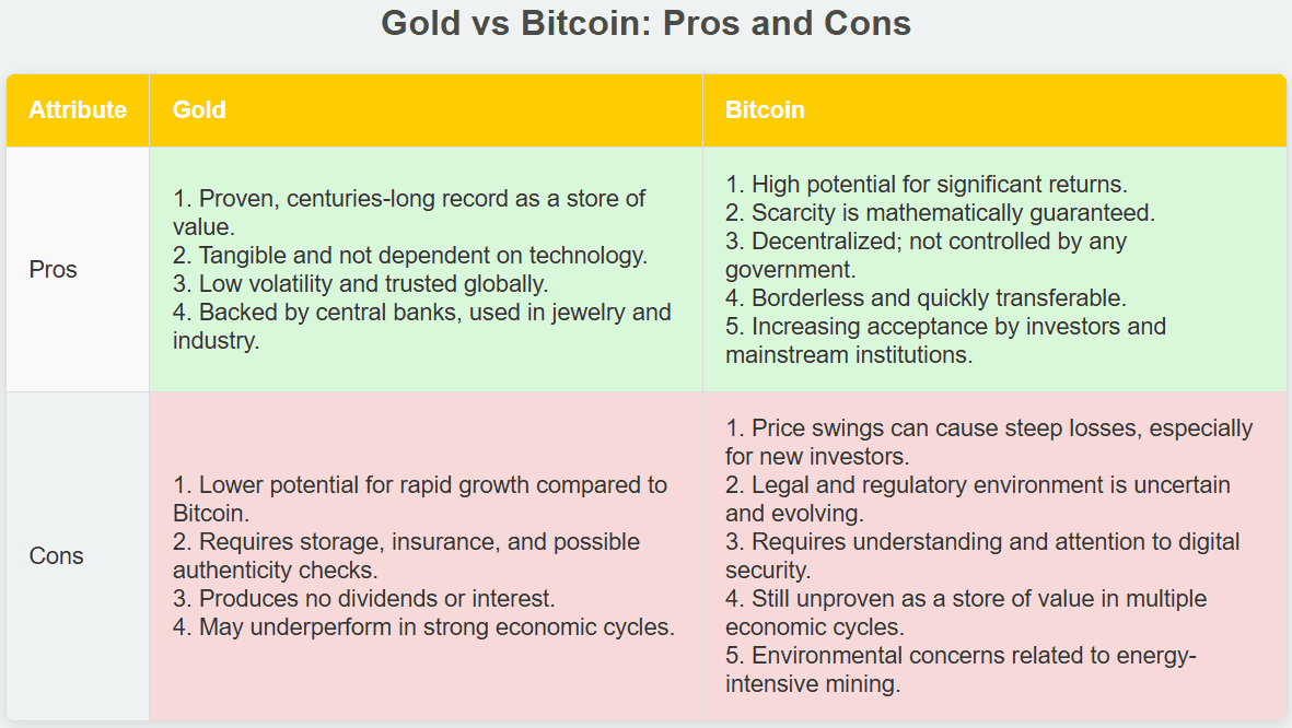 الاستثمار للمبتدئين: الذهب هو الملاذ الآمن الكلاسيكي عبر التاريخ، بينما يقدم البيتكوين الابتكار الرقمي وإمكانات التحول الجذري.