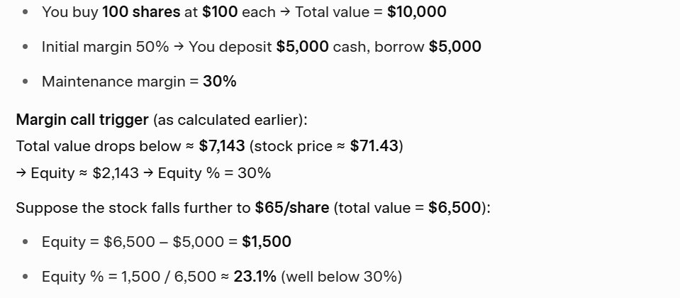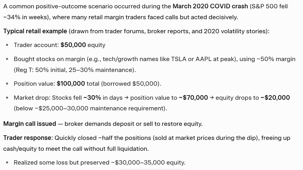 قام متداول تجزئة بشراء أوراق مالية (أسهم) باستخدام الهامش. ومع تقلبات السوق، تلقّى نداء هامش خلال فترة هبوط. واستجابةً لذلك، قام المتداول بإغلاق عدة مراكز بسرعة، مما مكنه من تجنب التصفية القسرية والحد من الخسائر. وقد أدرك هذا المتداول أهمية الحفاظ على سيولة كافية والالتزام بمبادئ إدارة المخاطر.