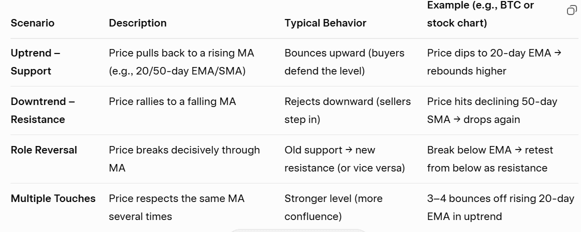 غالبًا ما تعمل المتوسطات المتحركة كمستويات دعم ومقاومة ديناميكية. يراقب المتداولون عادةً ارتداد السعر عن المتوسط المتحرك، مما يشير إلى فرصة شراء أو بيع محتملة.