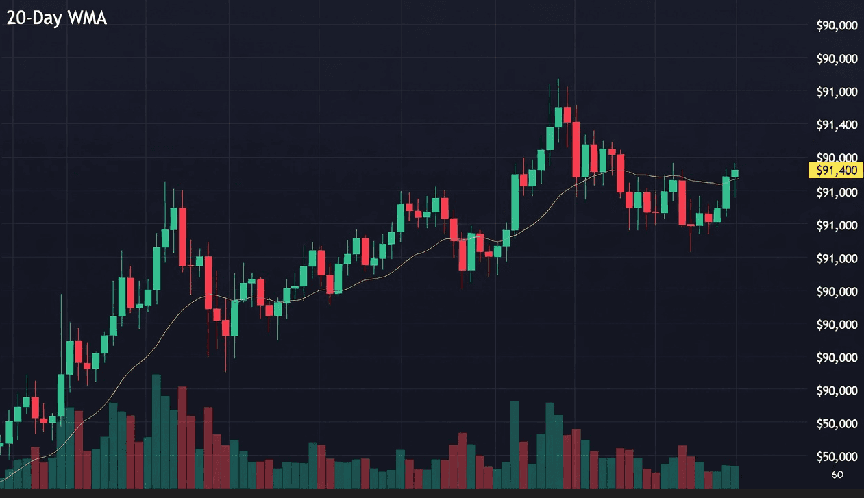 يعطي المتوسط المتحرك المرجح (WMA) أوزانًا مختلفة لنقاط الأسعار، مع التركيز على البيانات الأخيرة أكثر من البيانات القديمة.