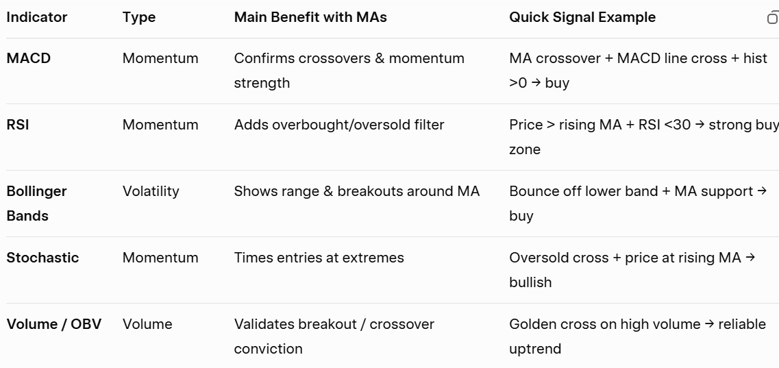 عند استخدام المتوسطات المتحركة، غالبًا ما يقوم المتداولون بدمجها مع مؤشرات فنية أخرى لتعزيز اتخاذ القرار. فيما يلي بعض أفضل المؤشرات التي يمكن استخدامها مع المتوسطات المتحركة: