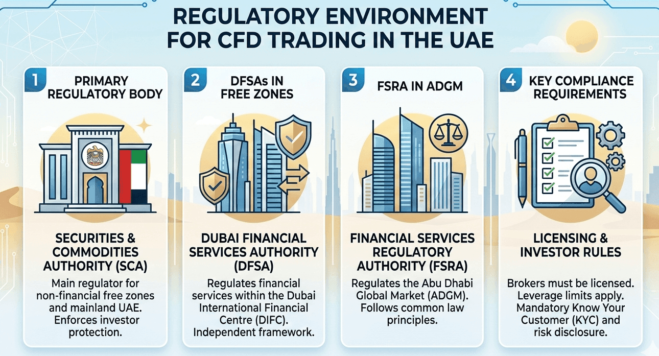 أنشأت الإمارات عدة هيئات تنظيمية للإشراف على أنشطة التداول في الأسواق المالية. أهم هيئتين تنظمان تداول عقود الفروقات هما:
