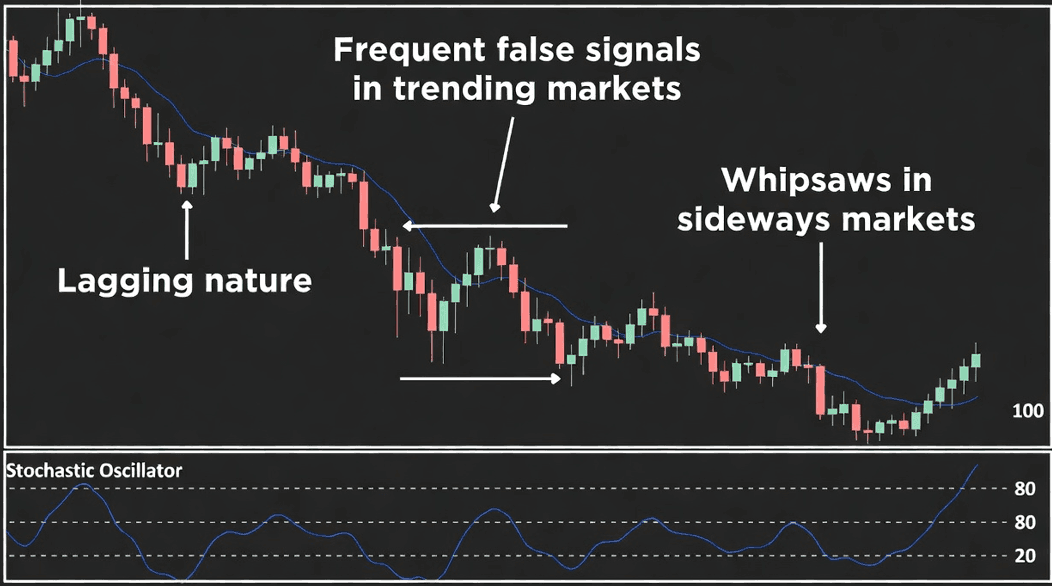 أحد القيود هو احتمال صدور إشارات خاطئة، خصوصًا خلال الاتجاهات القوية. فقد يبقى المؤشر في مناطق التشبّع الشرائي أو البيعي لفترات ممتدة، مما قد يضلل المتداولين ويجعلهم يعتقدون أن انعكاس السعر وشيك. ولهذا السبب، يجب على المتداولين دائمًا البحث عن تأكيد قبل اتخاذ أي قرارات اعتمادًا على إشارات الستوكاستك فقط.
