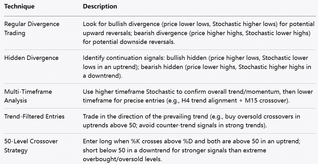 للمتداولين الراغبين في تعظيم استفادتهم من المذبذب العشوائي، يمكن لتطبيق تقنيات تداول متقدمة أن يوفر ميزة تنافسية. التحليل متعدد الأطر الزمنية هو أحد هذه الأساليب، حيث يمكّن المتداولين من رؤية حركة السعر عبر فترات زمنية مختلفة لتعزيز قرارات التداول. من خلال تحليل الستوكاستك على أطر زمنية أطول أثناء تنفيذ الصفقات على أطر أقصر، يمكن للمتداولين تحديد الاتجاهات العامة مع تحديد أفضل نقاط الدخول والخروج.