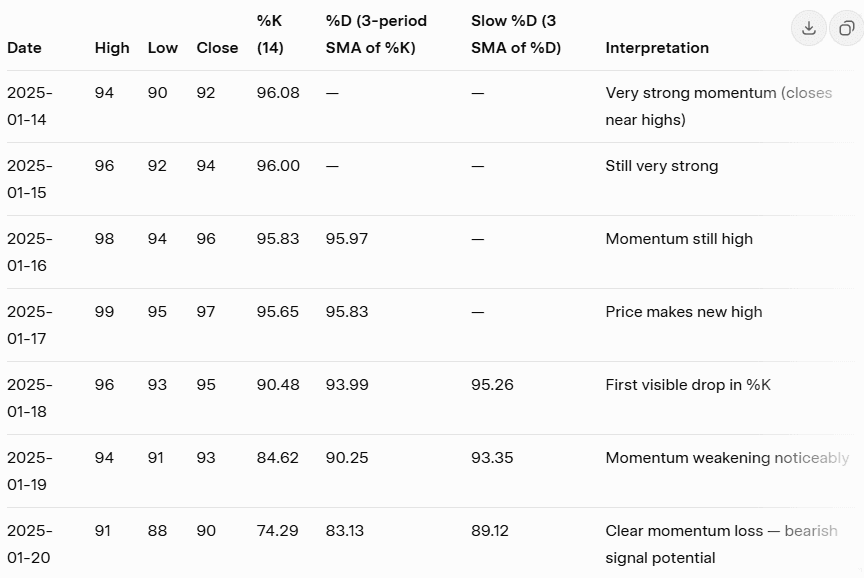 فيما يلي سلسلة أسعار واقعية لمدة 20 يومًا تُظهر اتجاهًا صاعدًا قويًا يفقد زخمه تدريجيًا في الأيام الأخيرة (مكاسب أصغر، إغلاقات تبتعد عن القمم، وظلال علوية أكبر). يُعد هذا السيناريو إعدادًا كلاسيكيًا لحدوث انفراج سلبي (Bearish Divergence) على مؤشر الستوكاستك.