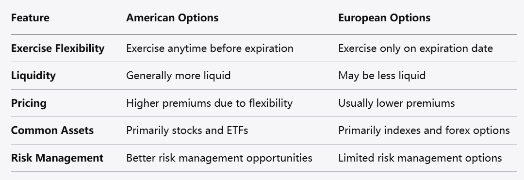 الخيارات الأمريكية: يمكن تفعيلها في أي وقت قبل أو عند تاريخ الانتهاء، مما يمنح المتداولين مرونة أكبر للاستفادة من تحركات الأسعار المواتية.