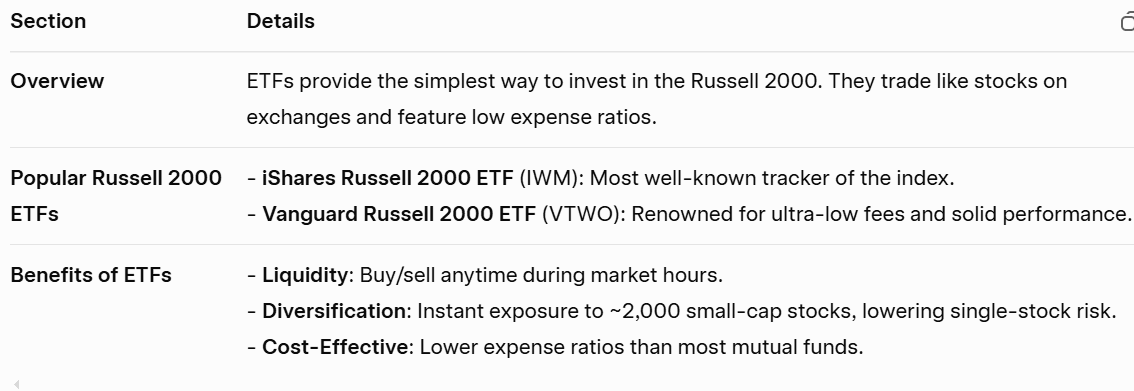 تُعد الصناديق المتداولة في البورصة (ETFs) وسيلة أكثر سهولة وكفاءة للحصول على تعرّض لمؤشر راسل 2000. إذ صُممت هذه الصناديق لتتبع أداء المؤشر من خلال الاحتفاظ بنفس الأوراق المالية التي يضمها. ومن أشهر صناديق ETFs المرتبطة بمؤشر راسل 2000 ما يلي: