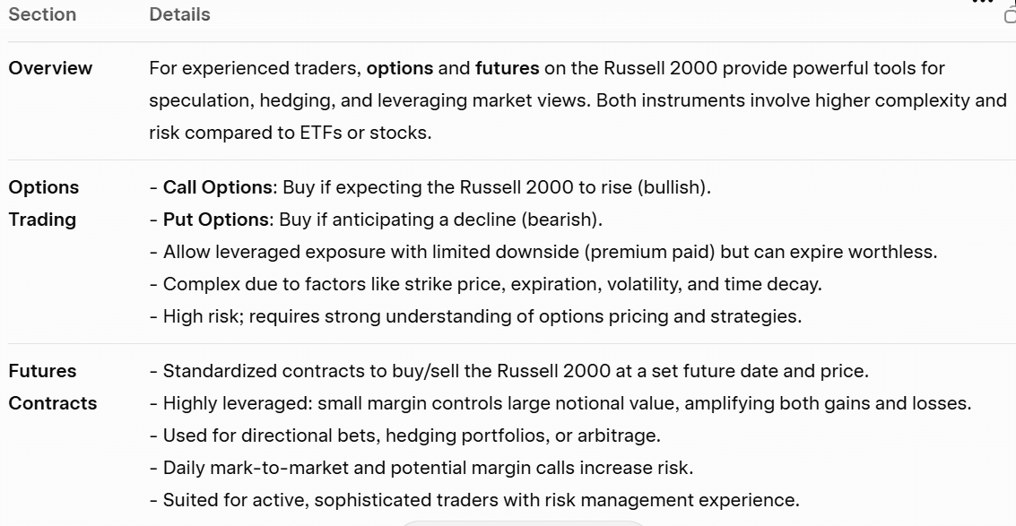 تداول الخيارات: يمكن للمستثمرين شراء خيارات الشراء (Call) إذا توقعوا ارتفاع مؤشر راسل 2000، أو شراء خيارات البيع (Put) إذا توقعوا انخفاضه. ويُعد تداول الخيارات معقدًا ويحمل مخاطر كبيرة، لذلك فإن الفهم العميق ضروري قبل الدخول فيه.