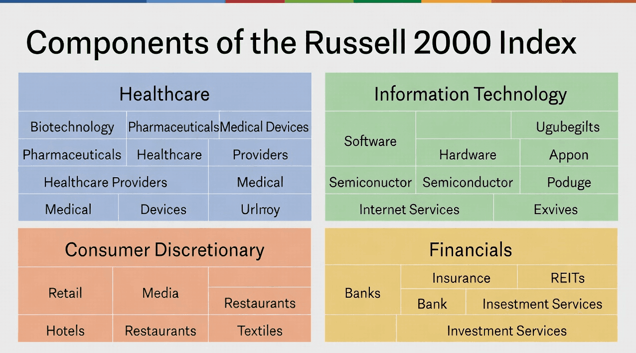 يتكوّن مؤشر راسل 2000 من شركات تنتمي إلى قطاعات متعددة. وتشمل أبرز القطاعات داخل المؤشر ما يلي: