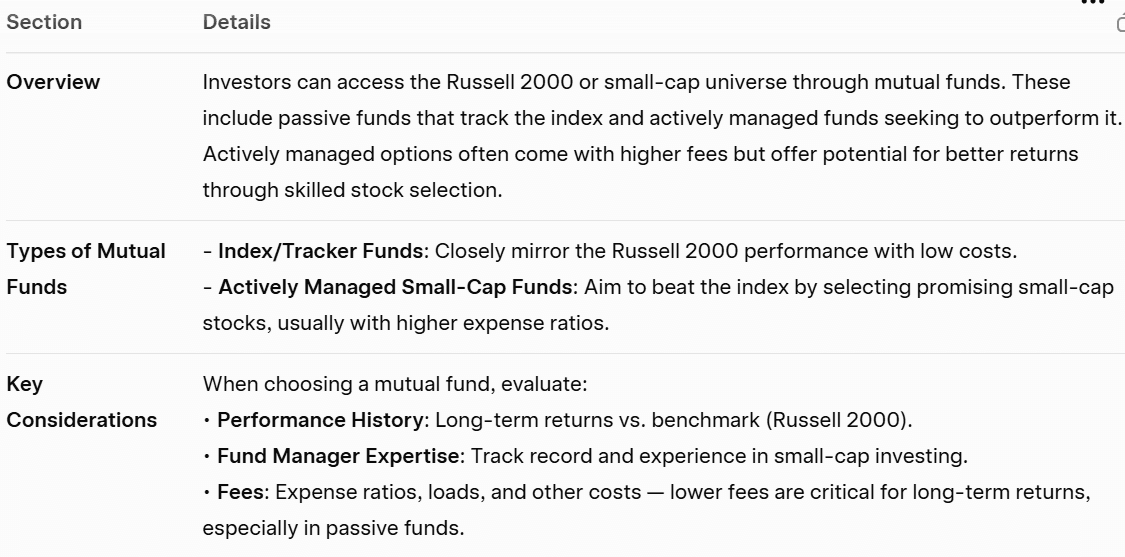 يمكن للمستثمرين أيضًا اختيار الصناديق الاستثمارية المشتركة التي تركز على أسهم الشركات الصغيرة، أو تلك التي تهدف تحديدًا إلى محاكاة أداء مؤشر راسل 2000. وعلى الرغم من أن الصناديق المُدارة بنشاط قد تفرض رسومًا أعلى، فإنها قد توفر فرصًا للتفوق على أداء المؤشر.