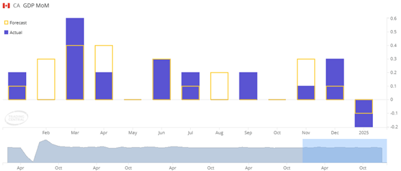 Im November 2024 schrumpfte die kanadische Wirtschaft um 0,2 %, vor allem aufgrund von Arbeitsniederlegungen im Transport- und Hafenbereich, die zu Rückgängen in Sektoren wie Bergbau und Ölförderung führten. Vorläufige Schätzungen deuten jedoch auf einen Anstieg des BIP um 0,2 % im Dezember hin, der vor allem auf den Einzelhandel, das verarbeitende Gewerbe und die Erholung der Bauwirtschaft zurückzuführen ist. Das Wachstum wird vor allem durch die Beilegung von Arbeitskonflikten und die Konsumausgaben in der Urlaubssaison gestützt.