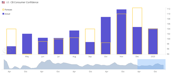 Der Verbrauchervertrauensindex in den Vereinigten Staaten lag im Januar 2025 bei 104,1 und damit leicht unter dem geschätzten Wert von 105,7, was auf einen leichten Rückgang des Optimismus der Verbraucher hindeutet. Es wird erwartet, dass der Februar-Wert entweder unverändert bleibt oder leicht ansteigt, da die wirtschaftliche Unsicherheit und die Inflation die Stimmung weiterhin beeinflussen. Obwohl der gute Arbeitsmarkt das Verbrauchervertrauen stärkt, sorgen Bedenken über die Inflation, steigende Kosten und geopolitische Spannungen für Unsicherheit, was zu einem gemischten Ausblick führt. Angesichts dieser Faktoren dürfte das Verbrauchervertrauen in nächster Zeit etwas gedämpft bleiben.