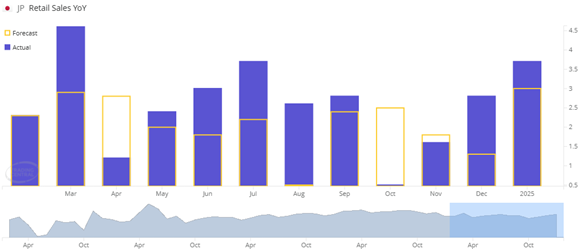 Japan verzeichnete im Dezember 2024 einen Anstieg der Einzelhandelsumsätze um 3,7 % gegenüber dem Vorjahresmonat und erreichte mit einem Wert von rund 16,123 Billionen Yen den höchsten Stand seit sechs Monaten. Dieses Wachstum wurde durch eine robuste Leistung in Sektoren wie Textilien, Bekleidung, persönliche Güter und Nicht-Einzelhandel angetrieben. Mit Blick auf Januar 2025 wird erwartet, dass die japanischen Einzelhandelsumsätze im Jahresvergleich um 4,1% steigen werden, gestützt durch ein moderates Wirtschaftswachstum im Ausland und einen sich verstärkenden Einkommens-/Ausgabezyklus.