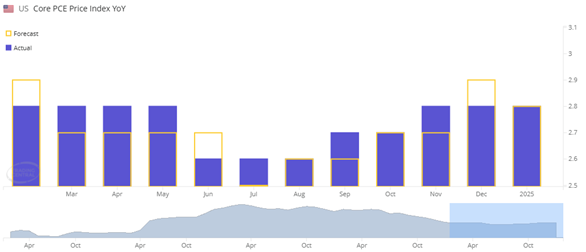 Im Dezember 2024 stieg der US-Kernpreisindex, der Nahrungsmittel und Energie ausschließt, im Jahresvergleich um 2,8 % und entsprach damit den Erwartungen. Dies spiegelt wider, dass die zugrunde liegende Inflation stabil bleibt und sich der Preisdruck in Grenzen hält. Für Januar 2025 wird mit einem Wert von 2,8% gerechnet, wobei der Inflationsdruck aufgrund der Energiepreise etwas nachlassen wird. Die Zinserhöhung der Federal Reserve in der Vergangenheit scheint ihr Ziel, die Inflation einzudämmen, erreicht zu haben, und es wird erwartet, dass die Kerninflation in der Nähe ihres Zielbereichs bleibt.