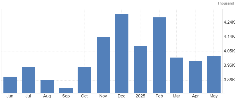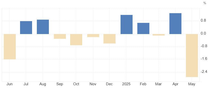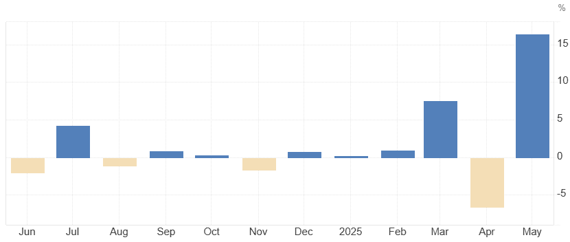 Die Auftragseingänge für langlebige Wirtschaftsgüter in den USA sind im Mai gegenüber dem Vormonat um 16,4 % gestiegen, wobei sich das Wachstum im Juni voraussichtlich deutlich auf 2,4 % verlangsamen wird. Die erwartete Verlangsamung spiegelt eine Normalisierung nach dem ungewöhnlich starken Anstieg im Mai wider, der durch einen sprunghaften Anstieg der Aufträge für Flugzeuge und Verteidigungsgüter bedingt war. Es wird erwartet, dass die Zahlen für Juni wieder auf typischere Niveaus zurückkehren werden, da sich die Kerninvestitionen der Unternehmen stabilisieren und die einmalige Volatilität bei den Transportaufträgen nachlässt. Diese Daten werden am 25. Juli um 12:30 GMT veröffentlicht.