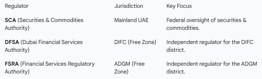 The SCA is the main regulatory body overseeing financial markets in the UAE. Its role includes: