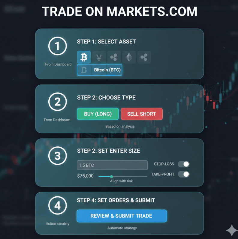 After placing your trades, actively monitor their performance. The Markets.com platform provides tools and notifications to stay updated on price movements and market conditions.