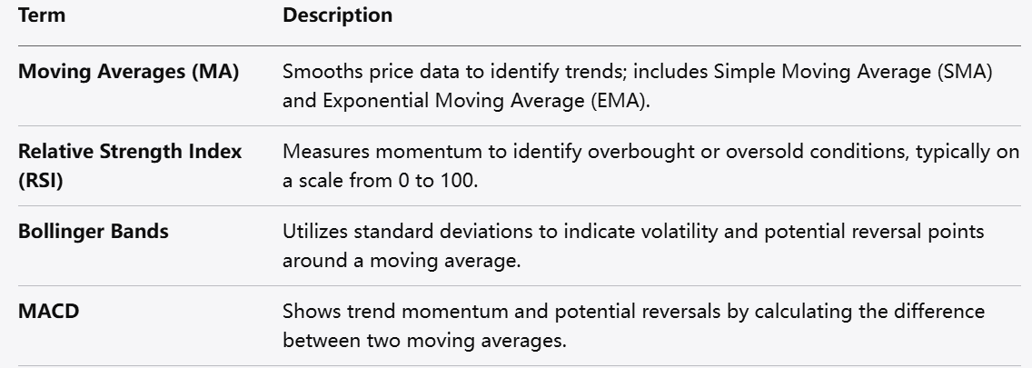 Moving Averages (MA): Smooth price data to identify trends. Common types include Simple Moving Average (SMA) and Exponential Moving Average (EMA).