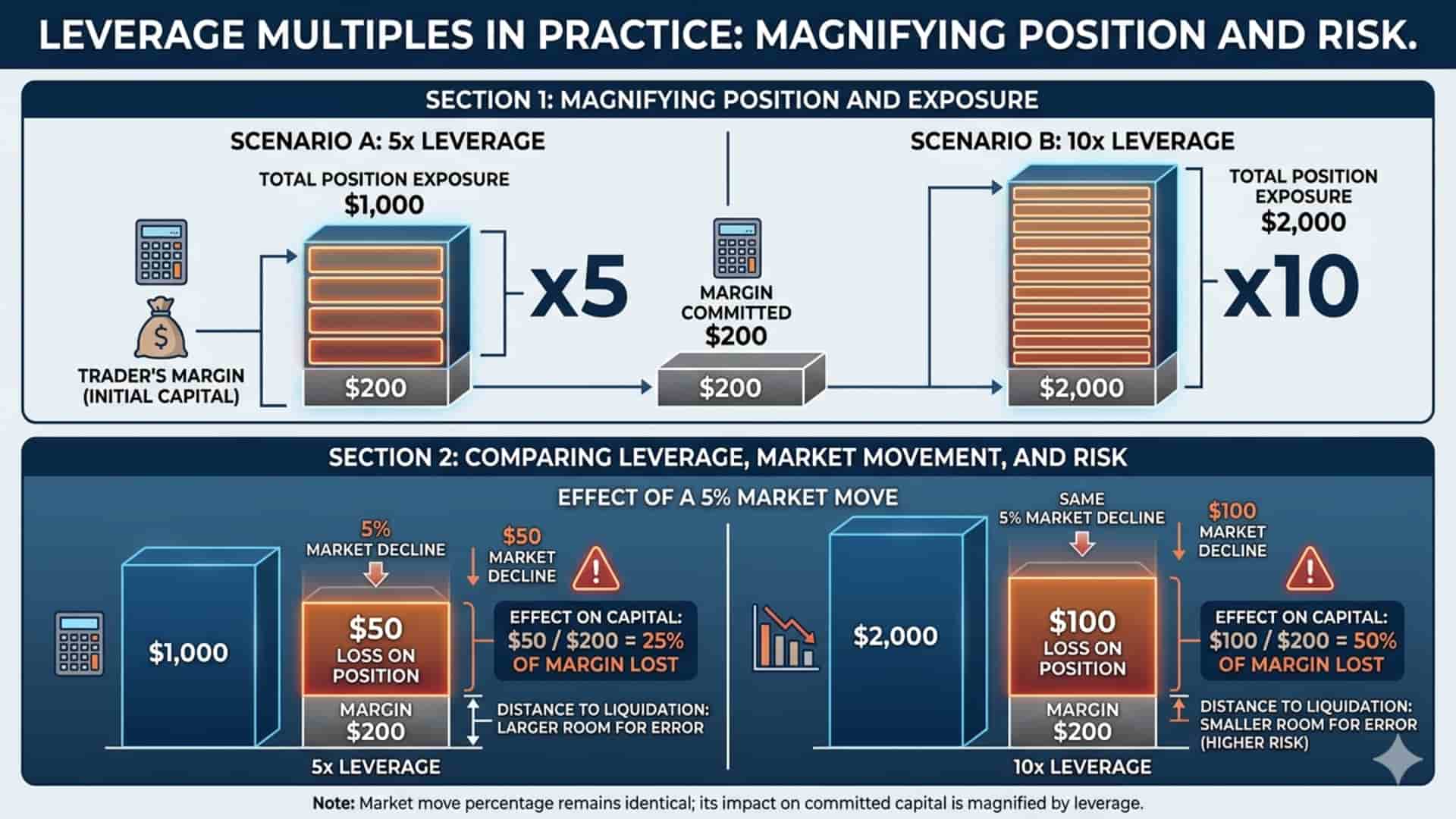 A common mistake is to focus only on leverage ratio without paying enough attention to total position size. In reality, these two factors must be considered together. A smaller position at moderate leverage may create very different account risk from a larger position at the same ratio.