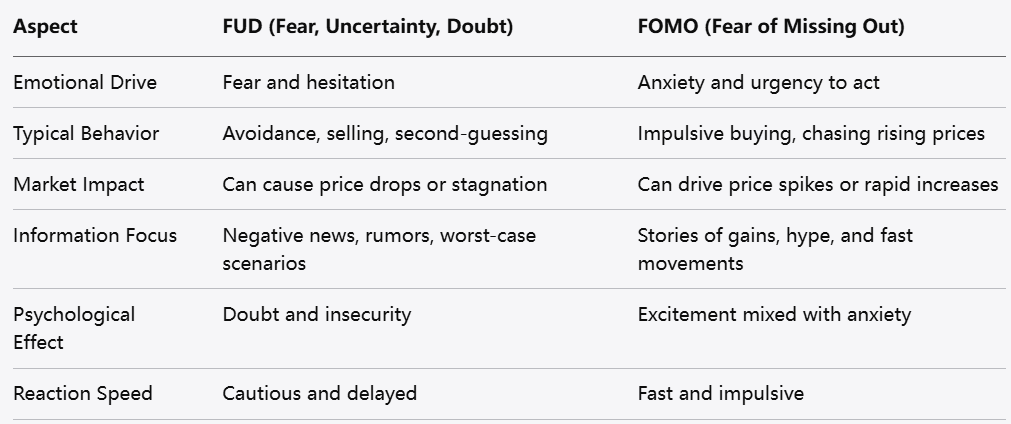 In short, FUD triggers fear and avoidance, while FOMO encourages hurried action driven by excitement or anxiety.