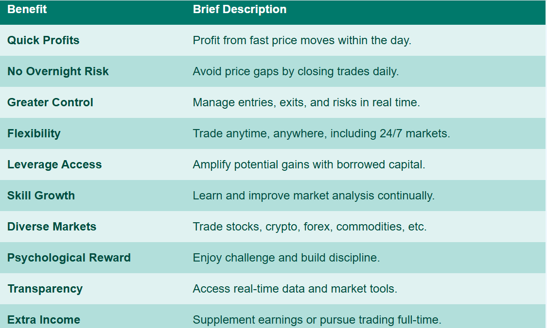 Day trading has become an increasingly popular approach to financial markets, especially with the rise of cryptocurrencies and online trading platforms. Unlike long-term investing, day trading involves buying and selling financial instruments within the same trading day, aiming to profit from short-term price movements. While it is often viewed as a challenging and high-risk activity, day trading offers several key benefits that attract many traders around the world. This article explores the main advantages of day trading and why it may be a suitable strategy for certain market participants.