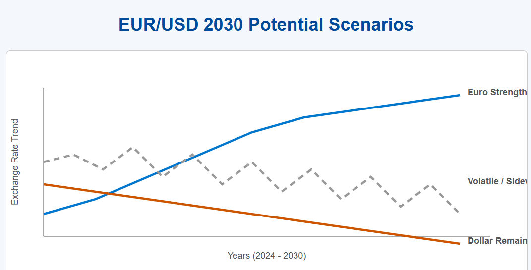 The euro to U.S. dollar exchange rate in 2030 will result from the interplay of economic growth trends, monetary and fiscal policies, political developments, structural changes, and global market sentiment.