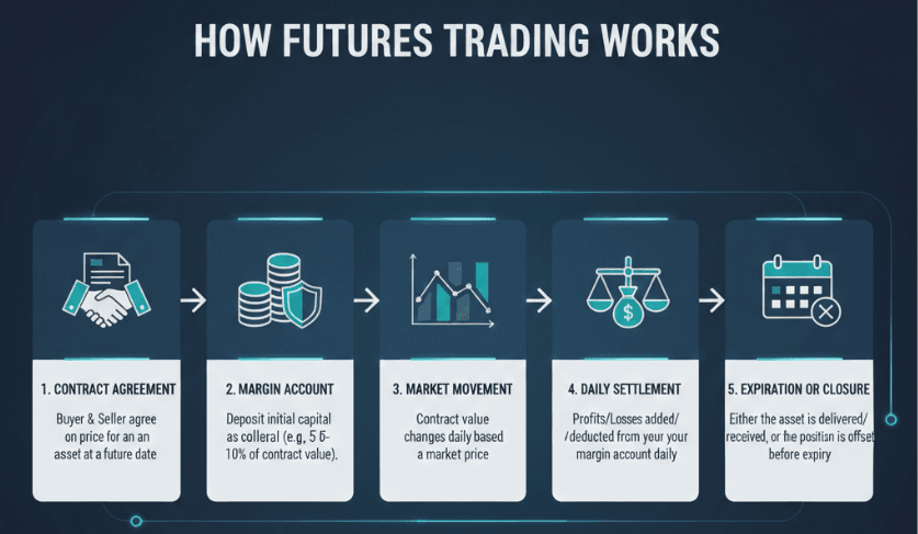 Opening a Trade: To enter a futures trade, the trader places an order with a broker. The trade can be initiated either as a long position (buy) or a short position (sell), depending on the trader's expectations of market movements.