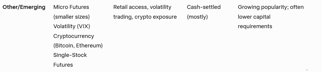 Financial Futures: This category includes contracts for financial instruments such as stock indices, interest rates, and currencies. Financial futures are often used to hedge financial portfolios against market fluctuations.