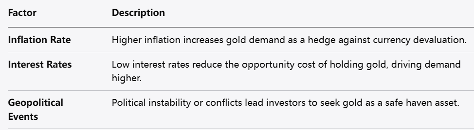 Geopolitical Events: Political instability or conflicts can push investors toward gold as a safe haven.