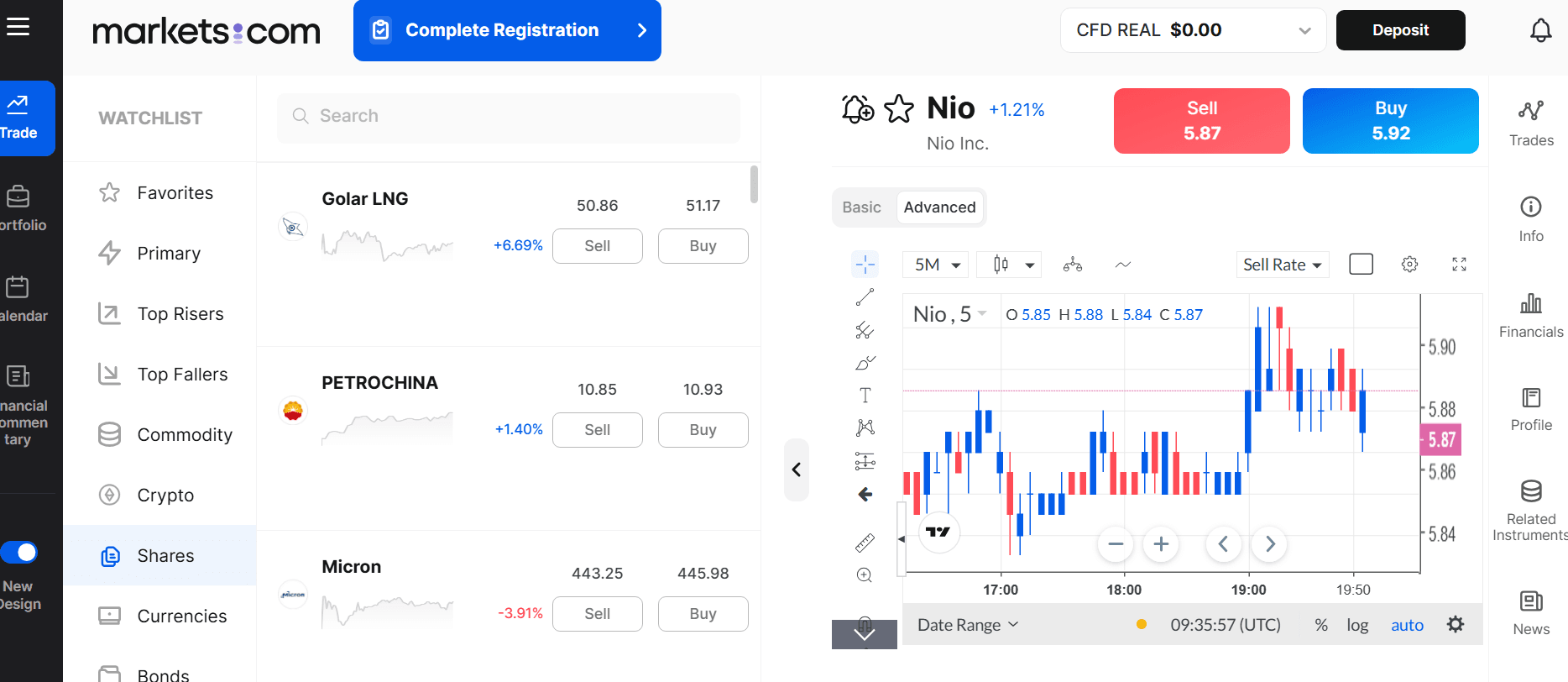 Looking to trade NIO stock CFDs? Choose Markets.com for a user-friendly platform, competitive spreads, and a wide range of assets. Take control of your trading journey today! Sign up now and unlock the tools and resources you need to succeed in the exciting world of CFDs. Start trading!