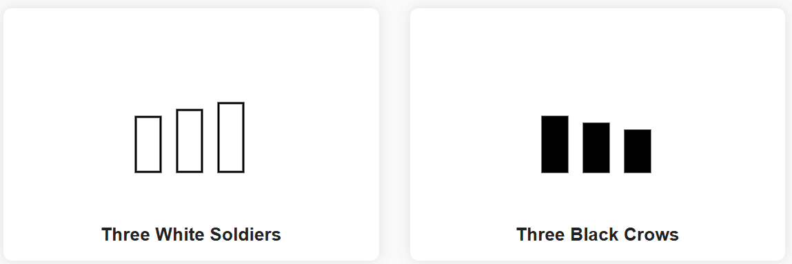 Consists of three consecutive long bullish candles with short wicks, showing steady buying pressure and a strong uptrend.