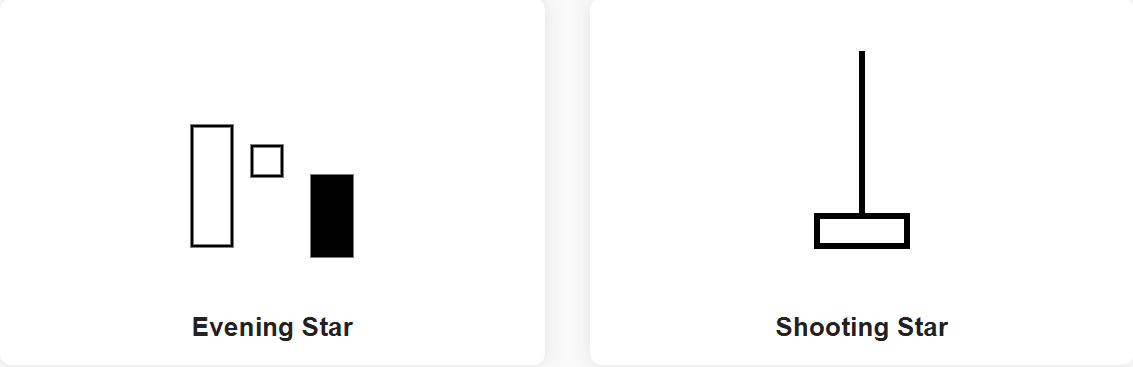 The bearish counterpart to the Morning Star, this pattern signals potential reversal after an uptrend with a bullish candle, a small-bodied candle, and then a bearish candle.