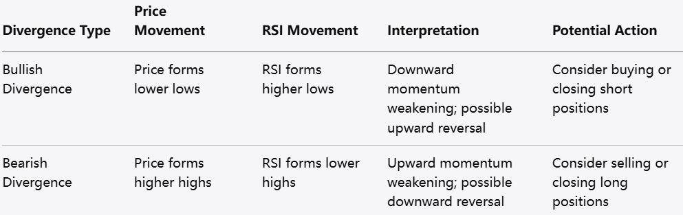 Bullish Divergence: Occurs when price forms lower lows, but RSI forms higher lows. This suggests weakening downward momentum and a possible upward reversal.