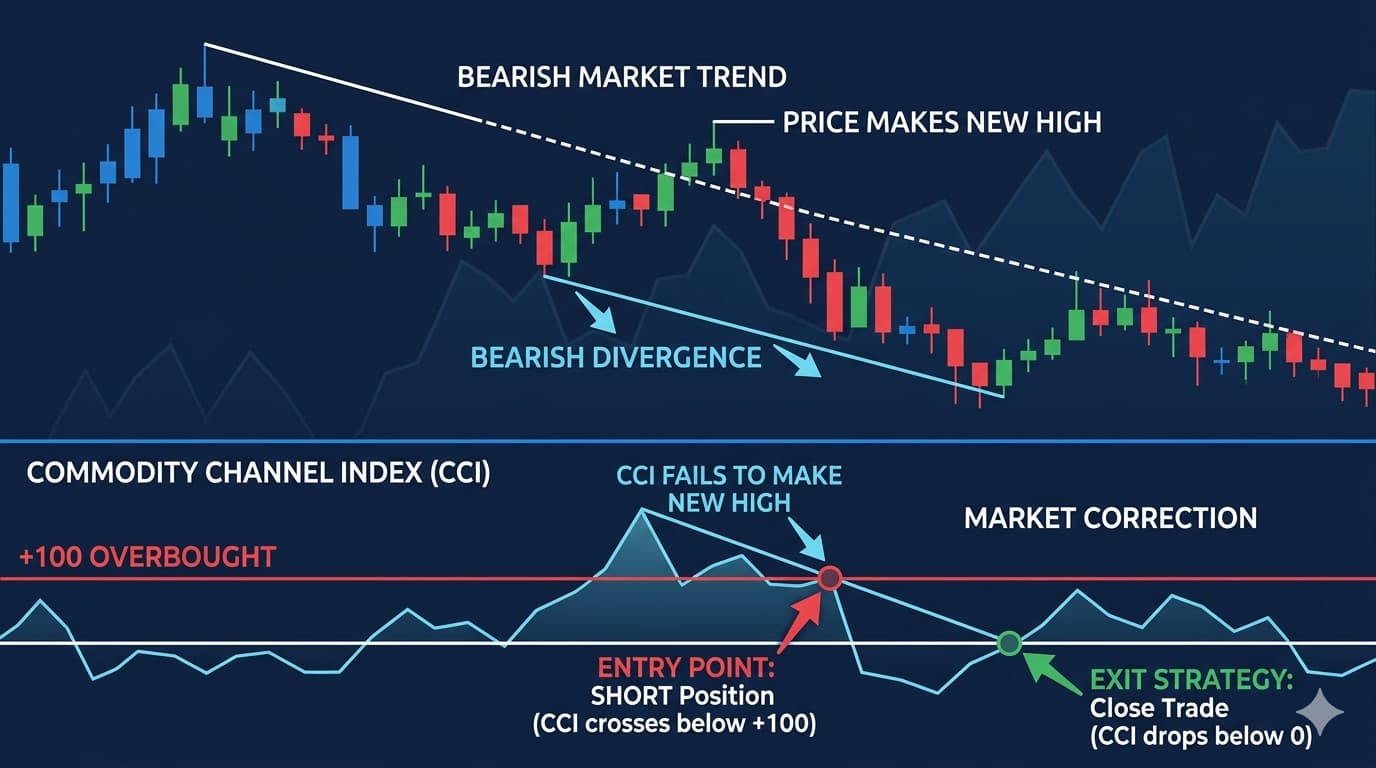 In a bearish market, the CCI rises above +100, signaling overbought conditions. A trader monitors the CCI as it begins to diverge from price movement, confirming the possibility of a market reversal. Taking a short position at this point allows the trader to benefit from the market correction.