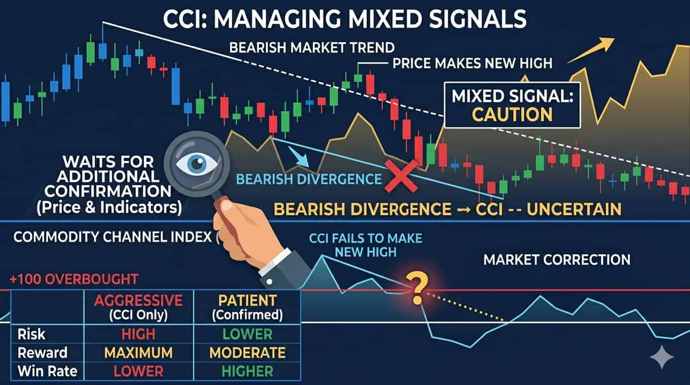 A trader may encounter mixed signals from the CCI. For example, if the CCI indicates overbought territory while the general market remains strong, it might necessitate caution in taking a short position.