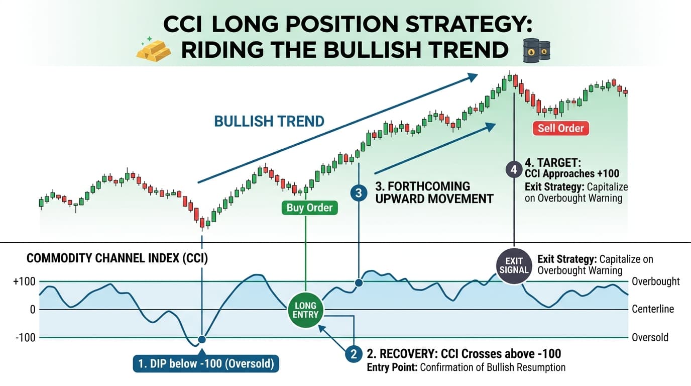 A trader observes that during a bullish trend in a commodity, the CCI begins to dip below -100. After reaching extreme oversold territory, it bounces back into positive levels. The trader enters a long position based on this recovery signal, capitalizing on the forthcoming upward movement.